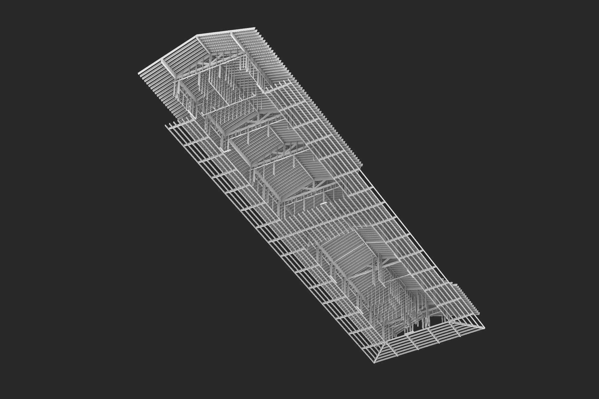 A vast roof spanning 63 meters unifies the different programmatic elements, creating generous covered outdoor circulation and framed views of the surrounding landscape. Positioned at the threshold between village and wilderness, the building opens itself to the dramatic terrain, allowing daily life to unfold in close relationship with the mountains.